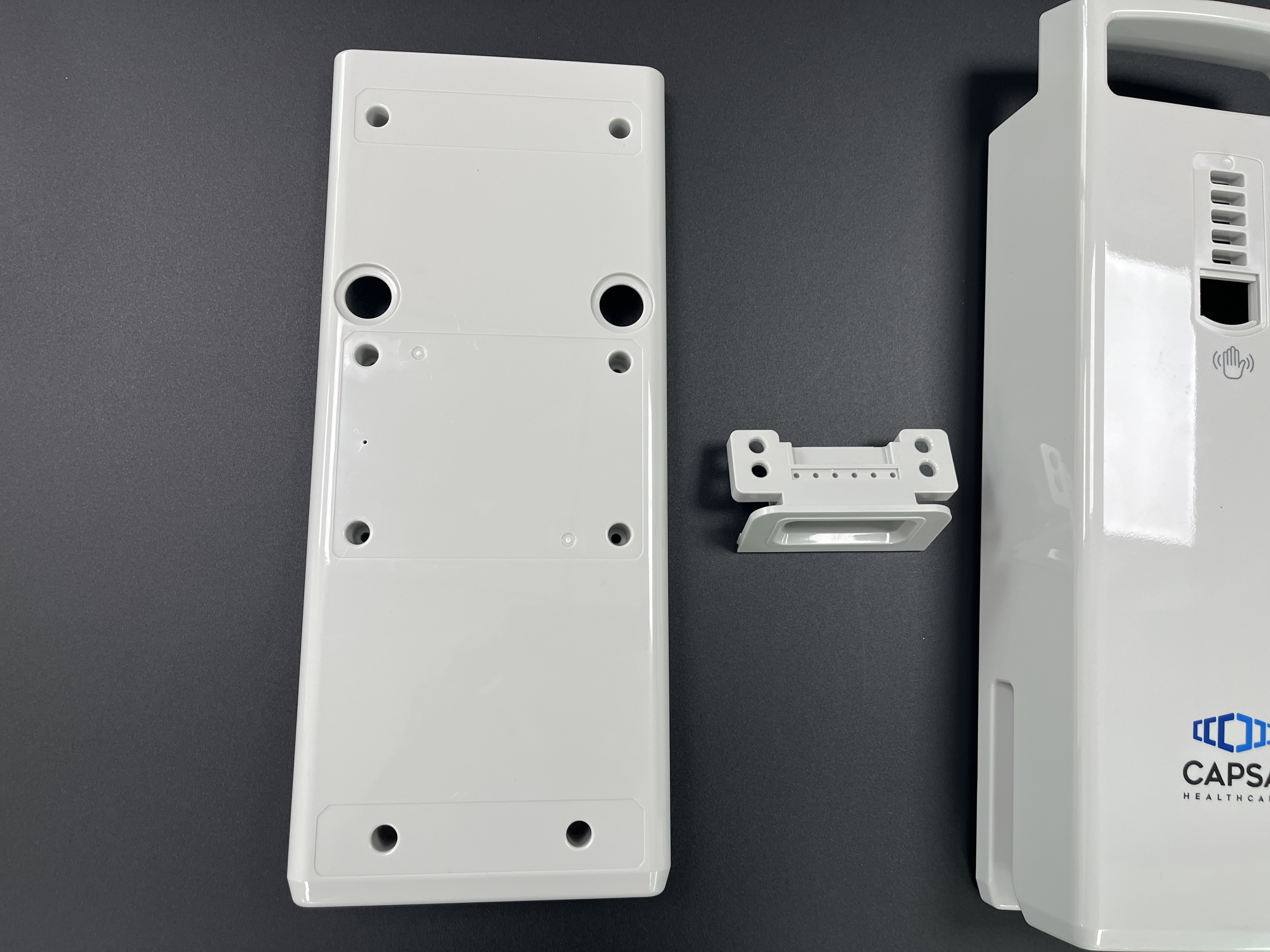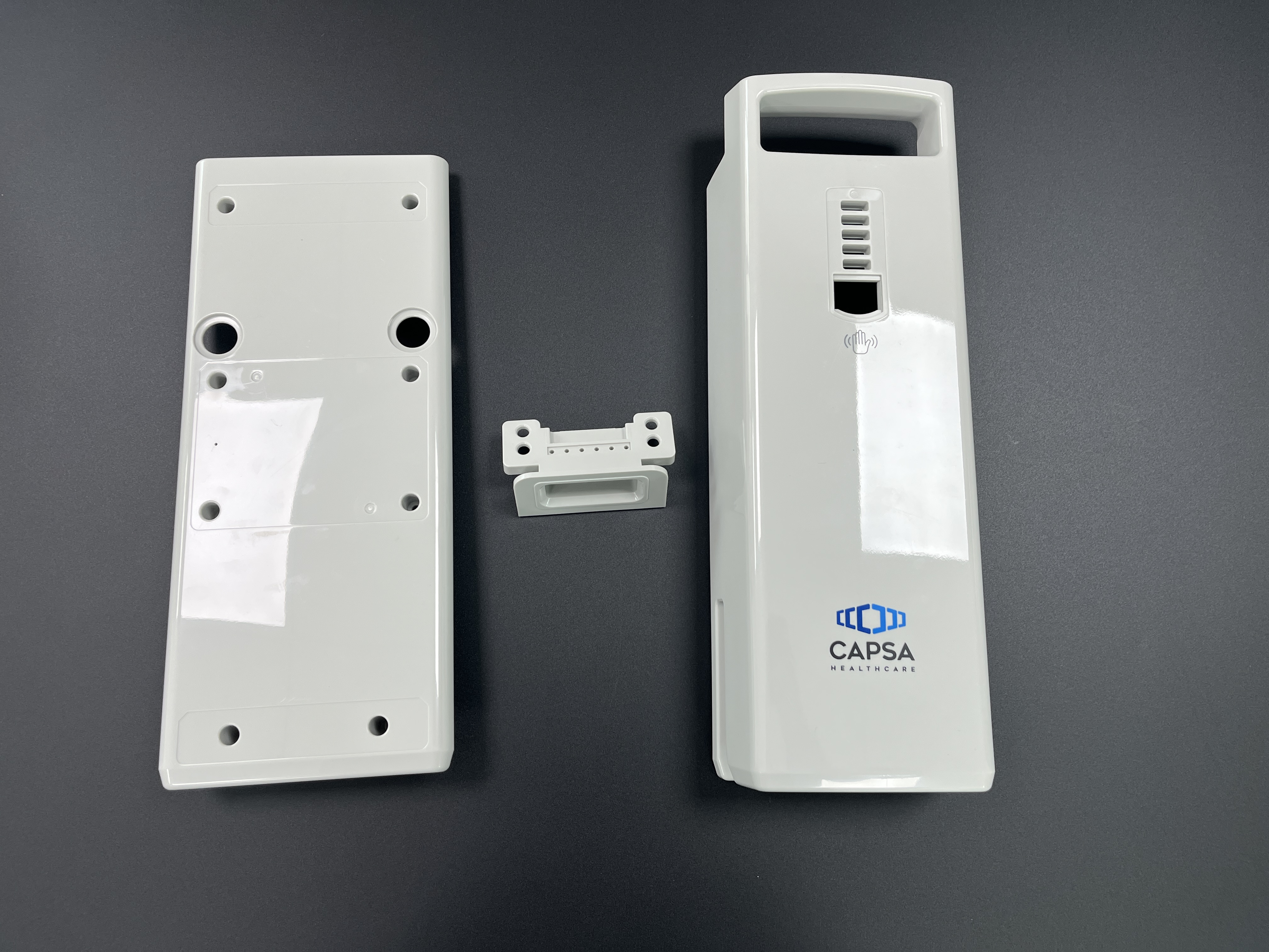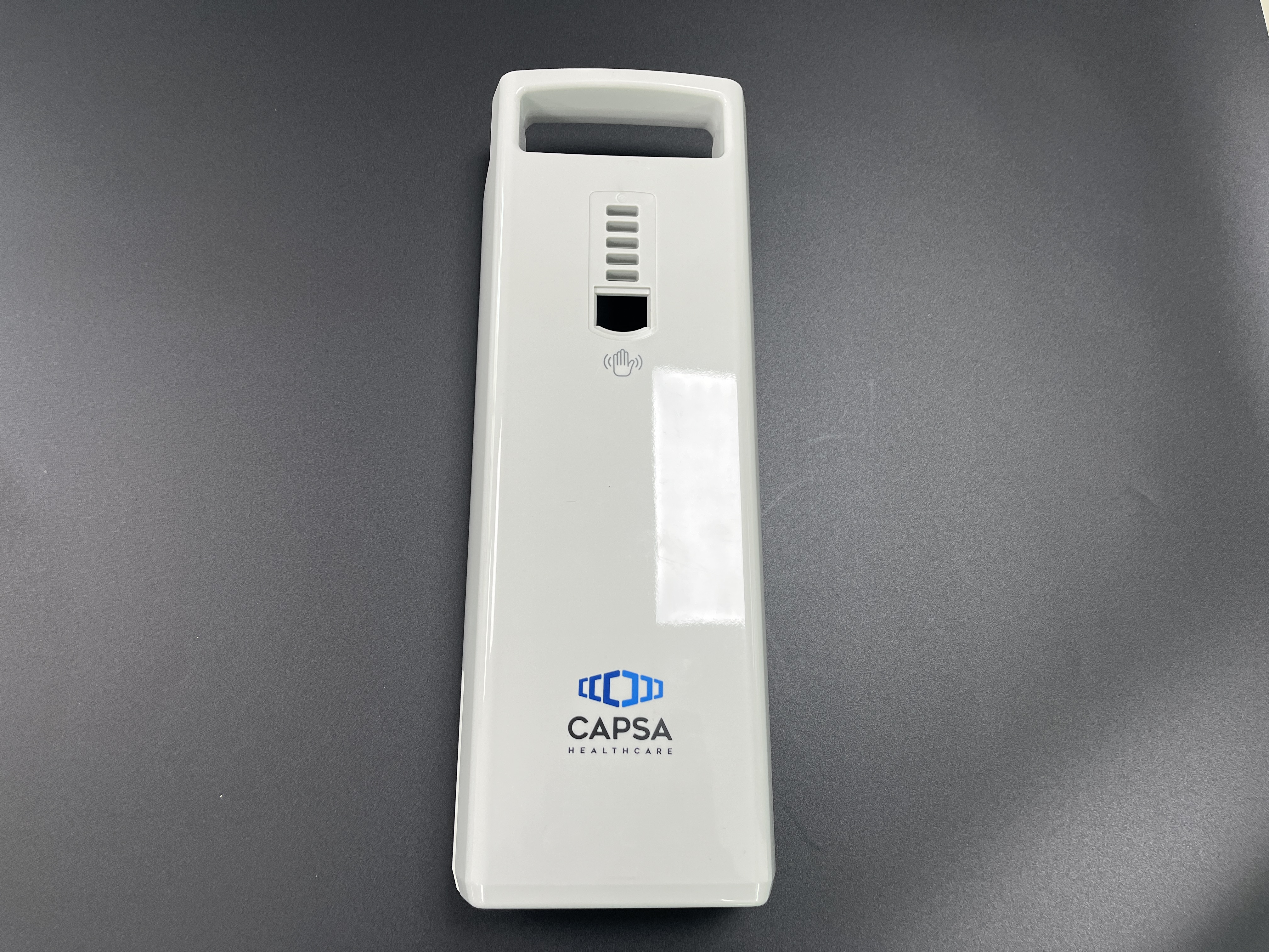 La superficie de alto brillo y resistente a los arañazos está impresa con el logotipo de CAPSA Healthcare, lo que brinda una apariencia limpia y profesional que se alinea con los estrictos estándares de higiene de hospitales y clínicas.